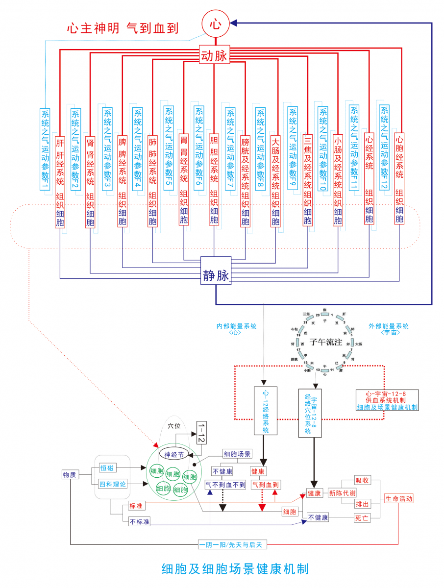 多少文人墨客,多少历代名医,均在《黄帝内经》的指导下为中华民族的健康繁衍保驾护航。微动微修科学团队通过研习《黄帝内经》,结合现代科学,发现了经络运行的两个机制:其一是为全身细胞提供血气循环的“心-12经络-细胞”供血机制;其二是帮助细胞进行物质能量信息交换的“心-宇宙-全身经脉-细胞”新陈代谢机制。