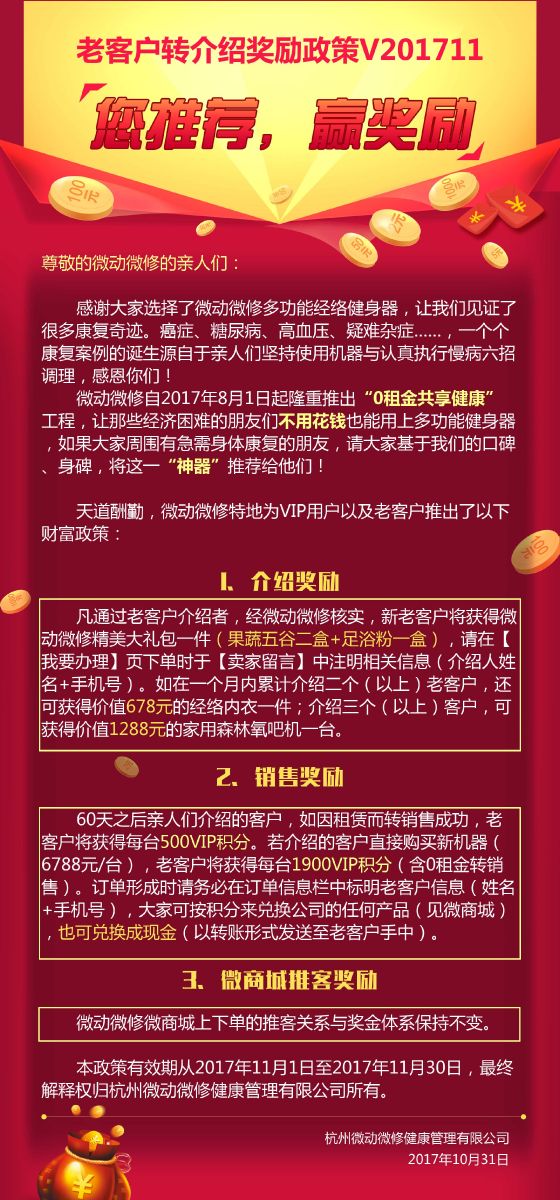 本政策有效期从2017年11月1日至2017年11月30日,最终解释权归杭州微动微修健康管理有限公司所有。
