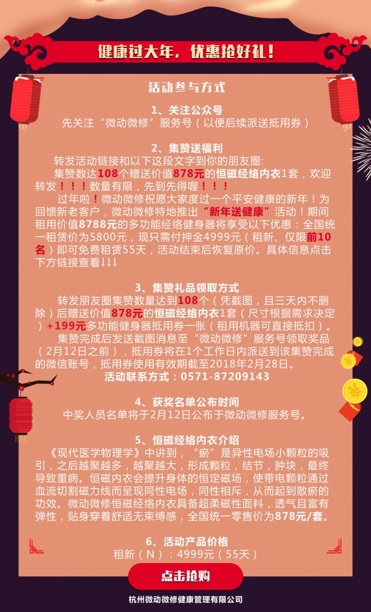 同时,关注微动微修服务号,转发活动链接与文字分享到朋友圈,参与集赞活动即可获得价值878元的恒磁经络内衣1套以及多功能健身器现金抵用券1张。机不可失,先到先得!