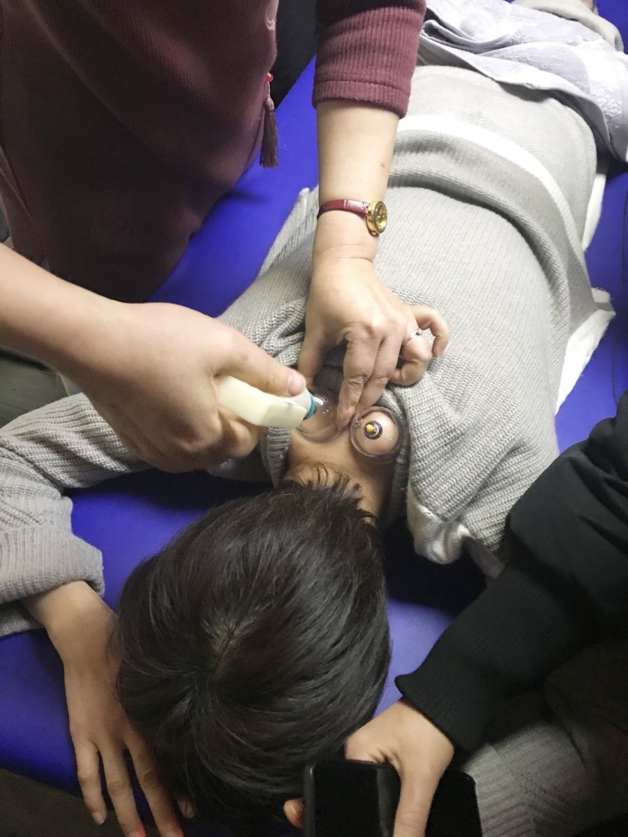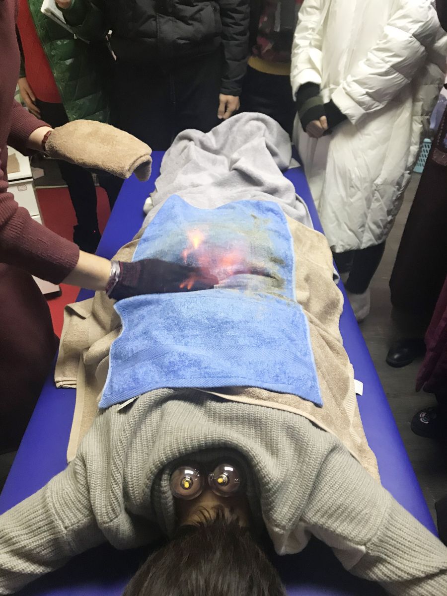 金今老师用专业的手法为大家演示了如何通过靶向能量、罐法和热疗的形式来调理经络上的三大问题: